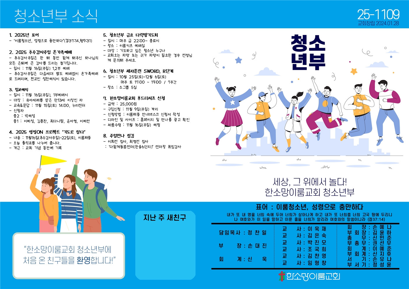 ÁÖÀÏ 1ºÎ¿¹¹è(09½Ã) ½Ã°£¿¡ ÃÊ6~°í3±îÁö û¼Ò³âµéÀ» À§ÇÑ ¿¹¹è°¡ ÀÖ½À´Ï´Ù. ¿¹¹è ÈÄ ¼±»ý´Ôµé°ú ºÐ¹Ý°øºÎ°¡ ÀÖ½À´Ï´Ù. Àϳâ 2ȸ ÀÌ»ó ¸ñ»ç´Ô°ú ÇÔ²² û¼Ò³âºÎ ½Å¾Ó¾çÀ°ÈÆ·ÃÀÌ ÁøÇàµË´Ï´Ù.